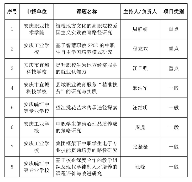 根據(jù)《安慶職業(yè)教育集團關于做好2020年教學改革研究課題申報工作的通知》文件精神,經個人申報、學校推薦,集團秘書處按照相關程序組織形式審查、專家評審,現(xiàn)對集團2020年教學改革研究課題擬立項名單進行公示。