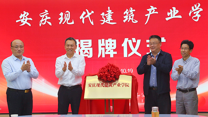 唐厚明、童宏葵、畢明生、謝長(zhǎng)兵共同為安慶現(xiàn)代建筑產(chǎn)業(yè)學(xué)院揭牌。