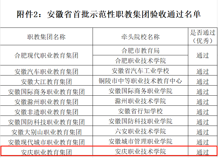近日,安徽省教育廳、安徽省經(jīng)濟(jì)和信息化廳共同發(fā)文通報(bào)我省首批立項(xiàng)建設(shè)省級(jí)示范性職教集團(tuán)的10家職教集團(tuán)驗(yàn)收結(jié)果,安慶職教集團(tuán)以優(yōu)秀成績(jī)順利通過驗(yàn)收。