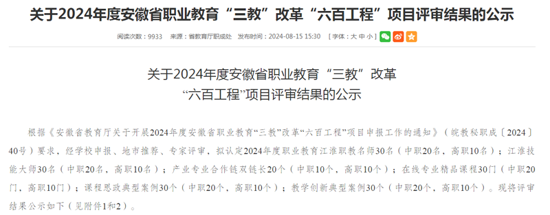 近日,安徽省教育廳公示了2024年度安徽省職業(yè)教育“三教”改革“六百工程”項(xiàng)目,集團(tuán)5所學(xué)校共7個(gè)項(xiàng)目入選。