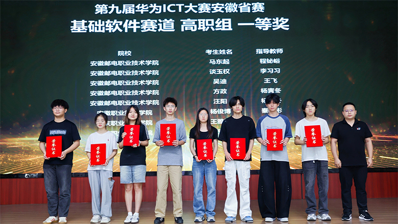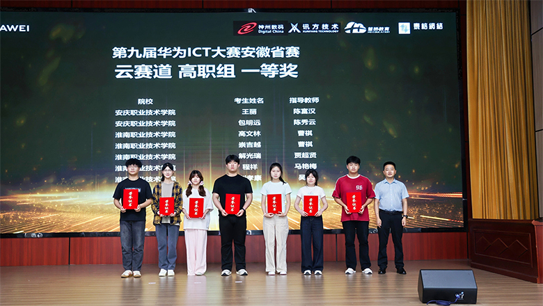 6月13日,第九屆華為ICT大賽安徽省賽頒獎(jiǎng)典禮暨華為ICT人才聯(lián)盟雙選會(huì)在安徽工業(yè)經(jīng)濟(jì)職業(yè)技術(shù)學(xué)院舉行。安徽省教育廳高教處三級(jí)調(diào)研員梅梅到會(huì)指導(dǎo)。安慶職業(yè)技術(shù)學(xué)院信息技術(shù)學(xué)院學(xué)生在此次大賽上獲一等獎(jiǎng)3項(xiàng),指導(dǎo)教師、獲獎(jiǎng)學(xué)生代表應(yīng)邀出席頒獎(jiǎng)典禮和雙選會(huì)。