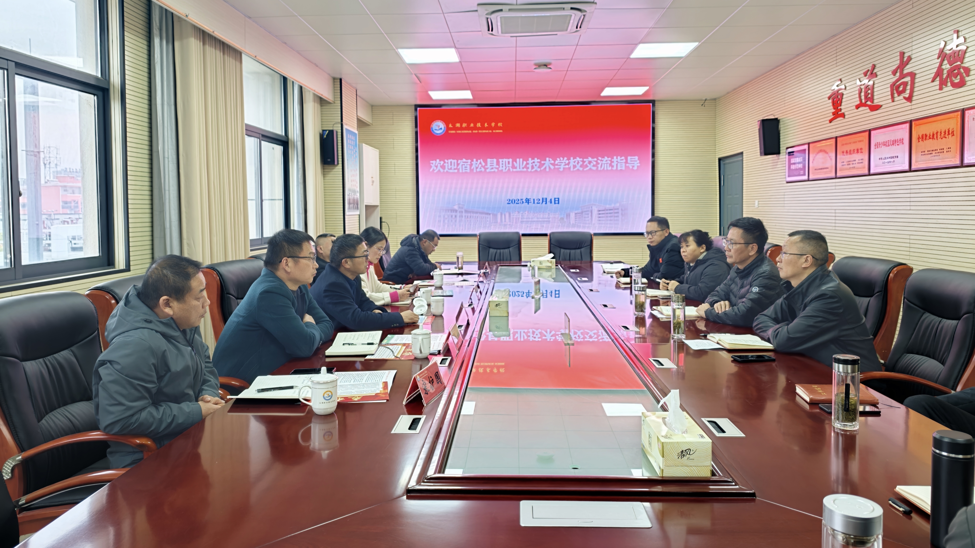 12月4日,宿松縣職業(yè)技術(shù)學(xué)校黨支部書(shū)記、校長(zhǎng)鄧勝榮率領(lǐng)調(diào)研團(tuán)隊(duì)一行6人來(lái)訪我校,圍繞專業(yè)建設(shè)、辦學(xué)層次提升、教學(xué)管理、校企合作等核心議題開(kāi)展專題調(diào)研交流。我校班子成員及相關(guān)職能部門負(fù)責(zé)人參與接待,雙方通過(guò)座談研討與實(shí)地參觀,展開(kāi)深入交流,凝聚發(fā)展共識(shí)。