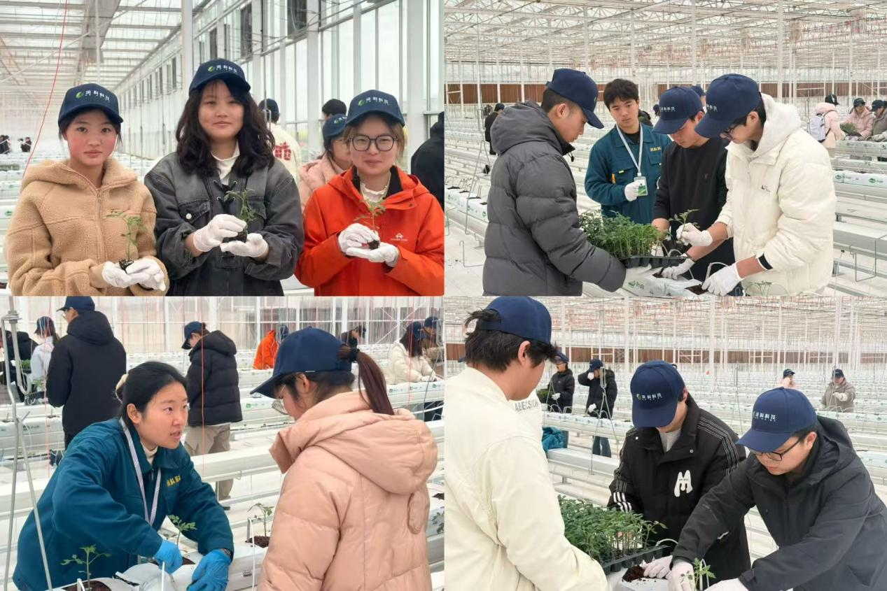 在大棚里,學(xué)生們被分為五個(gè)小組,分別由五名經(jīng)驗(yàn)豐富的潤(rùn)科農(nóng)業(yè)技術(shù)員擔(dān)任實(shí)踐導(dǎo)師,帶領(lǐng)大家了解現(xiàn)代化的連棟溫室大棚種植技術(shù)。技術(shù)員向同學(xué)們介紹了大棚內(nèi)的科技設(shè)備,隨后開(kāi)始現(xiàn)場(chǎng)示范番茄苗的定植操作。進(jìn)入動(dòng)手實(shí)踐環(huán)節(jié),大家2-3人一組、分工協(xié)作,小心翼翼地拿起番茄苗,按照技術(shù)員示范的步驟,對(duì)番茄苗進(jìn)行定植,在整齊排列的種植槽和剛剛鋪設(shè)好的椰糠基質(zhì)植袋上挖孔、放苗、培基質(zhì)、澆水,種下一株株幼苗。
