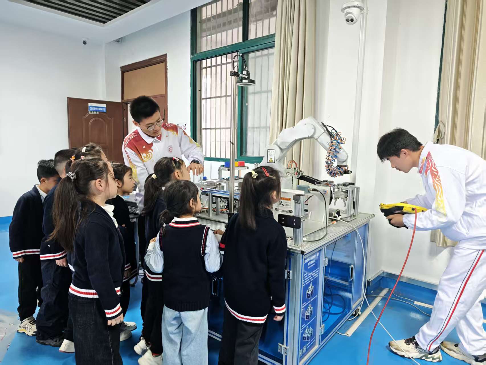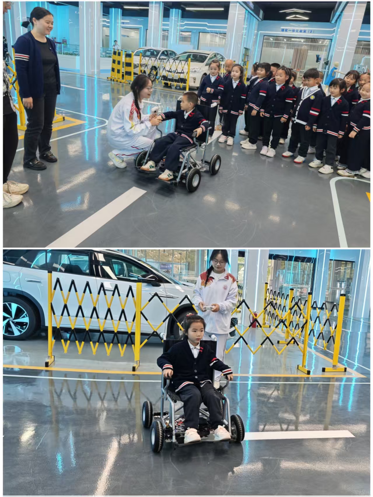 活動當(dāng)日,幼兒園師生一入校便受到熱情接待。在志愿者引導(dǎo)下,孩子們首先來到機電工程學(xué)院新能源汽車基地。師生們用童趣語言講解新能源汽車的環(huán)保特性與智能駕駛功能,并展示學(xué)院自主研發(fā)的智能輪椅。不少小朋友坐上輪椅親身體驗,近距離感受科技魅力。隨后,孩子們走進智能機器人實訓(xùn)基地,觀看機械臂精準(zhǔn)抓取、搬運物品的演示??吹綑C械臂靈活運轉(zhuǎn),小朋友們目不轉(zhuǎn)睛、連連驚嘆。