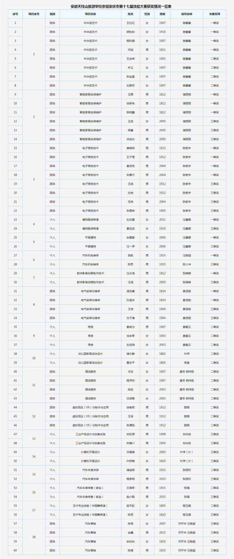 近日,安慶市第十七屆中職學校技能大賽成績揭曉,安徽天柱山旅游學校再創(chuàng)佳績,共有18 項 60 人次獲獎,其中一等獎8個17人次,二等獎12個19人次,三等獎16個24人次。一等獎獲獎項目占總賽項近三分之一。