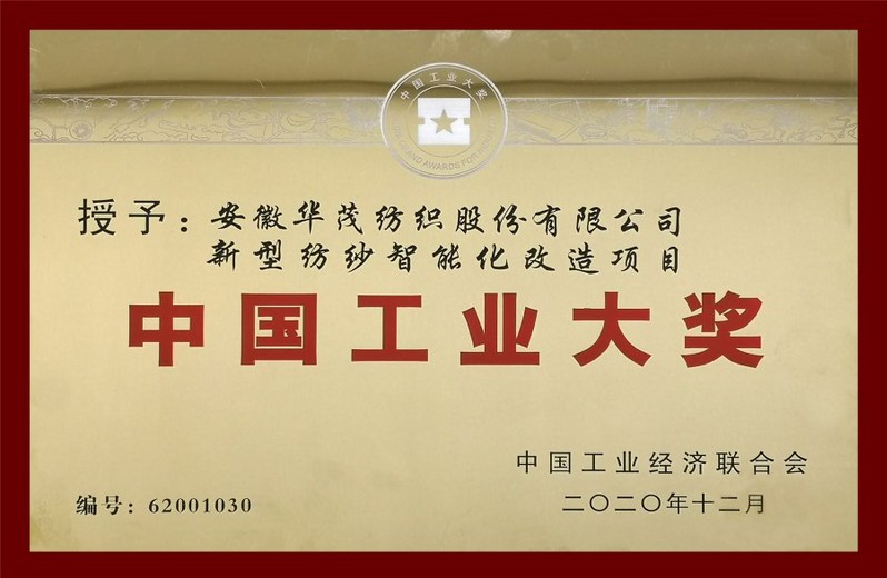 12月27日上午,從北京召開的第六屆中國工業(yè)大獎(jiǎng)發(fā)布會(huì)上傳來喜訊,由安徽華茂申報(bào)的新型紡紗智能化改造項(xiàng)目榮獲“中國工業(yè)大獎(jiǎng)”。中國工業(yè)大獎(jiǎng)是我國工業(yè)領(lǐng)域最高獎(jiǎng)項(xiàng),獎(jiǎng)項(xiàng)的獲得是對(duì)安徽華茂在以制造強(qiáng)國為己任、以產(chǎn)業(yè)報(bào)國為初心,堅(jiān)持自立自強(qiáng),走中國特色創(chuàng)新發(fā)展、綠色發(fā)展新型工業(yè)化道路等方面做出突出成績的充分肯定。
