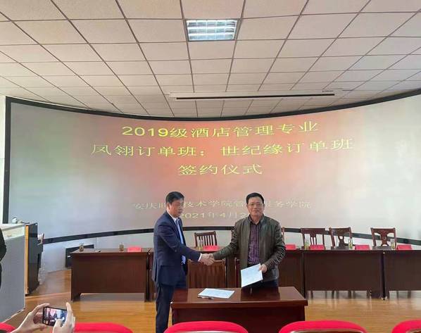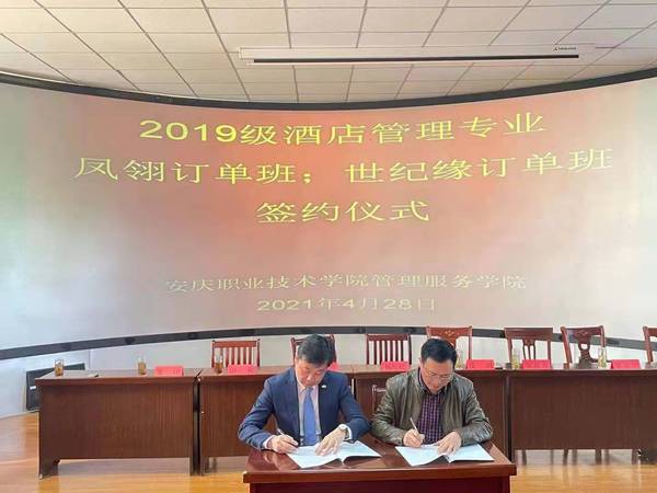 最后,校方代表楊厚松分別與安慶碧桂園鳳凰大酒店、安慶世紀緣國際大酒店負責人進行了現(xiàn)場簽約。本次訂單班的成功簽約,為酒店管理專業(yè)下一步開展更多的校企聯(lián)合育人奠定了基礎。(文:李敏 圖:李光壽等 審核:楊厚松)