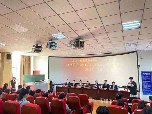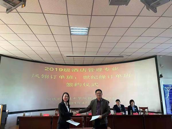 4月28日上午,安慶職業(yè)技術學院管理服務學院在3號教學樓216教室舉行校企業(yè)合作酒店管理專業(yè)“鳳翎訂單班”和“世紀緣訂單班”簽約儀式。管理服務學院副院長楊厚松、企業(yè)方代表、酒店管理專業(yè)部分教師和冠名班全體學生參加了此次簽約儀式。儀式由院長助理兼酒店管理專業(yè)建設負責人李敏老師主持。