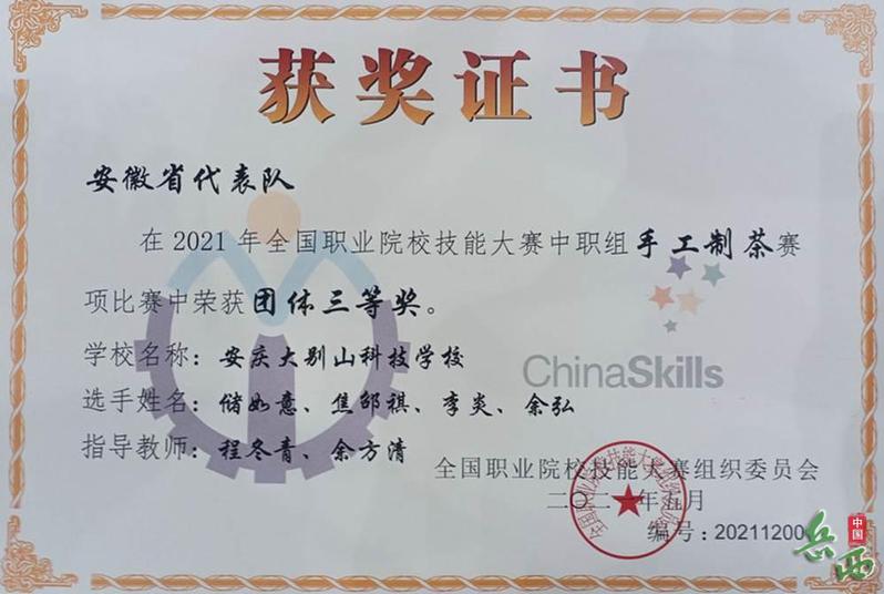 安慶大別山科技學(xué)校在2021年全國職業(yè)院校技能大賽(中職組)手工制茶項(xiàng)目比賽中榮獲團(tuán)體三等獎(jiǎng),該校學(xué)生焦邵祺、余弘、儲(chǔ)如意、李炎4名選手參賽。