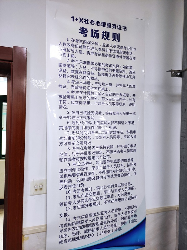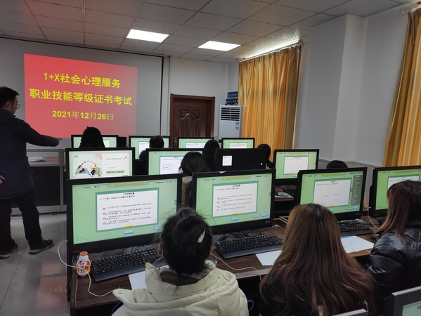 12月25日和12月26日下午,安慶職業(yè)技術(shù)學(xué)院管理服務(wù)學(xué)院“1+X”社會心理服務(wù)(中級)職業(yè)技能等級證書認證考試在圖文信息中心508、509機房順利舉行,2019級、2020級幼兒發(fā)展與健康管理專業(yè)共計100名同學(xué)參加了考試??荚嚻陂g,實訓(xùn)中心李進恩主任、管理服務(wù)學(xué)院院長高潤霞、副院長楊厚松現(xiàn)場督導(dǎo)考務(wù)工作。