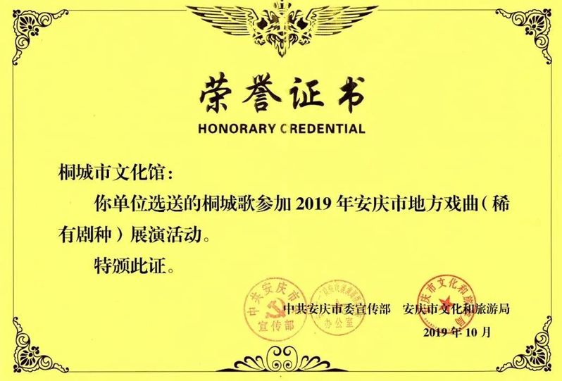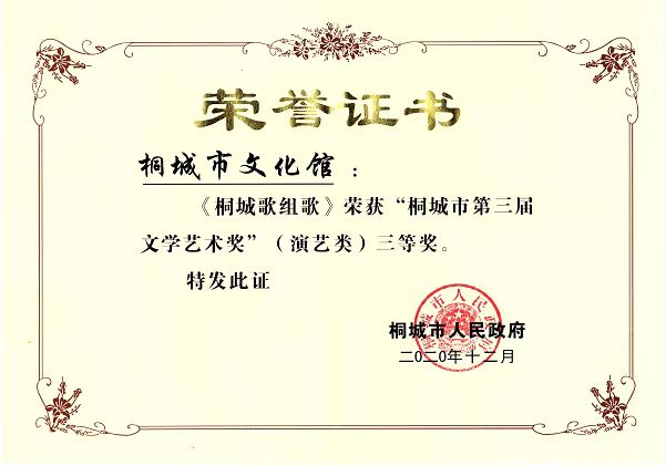 市文化館攜手中華職校開展豐富的“桐城歌”傳承傳習(xí)活動(dòng),組織業(yè)務(wù)人員對(duì)學(xué)生們的聲腔、方言、舞蹈動(dòng)作進(jìn)行專業(yè)系統(tǒng)培訓(xùn),演繹富有鄉(xiāng)土氣息的桐城歌音樂作品《桐城歌組歌》。2019年10月作品入選參加由中共安慶市委宣傳部、安慶市文化和旅游局舉辦的2019年安慶市地方戲曲(稀有劇種)展演活動(dòng),獲得一致好評(píng);2020年12月作品獲桐城市人民政府頒發(fā)的“第三屆文學(xué)藝術(shù)獎(jiǎng)”(演藝類)三等獎(jiǎng)。
