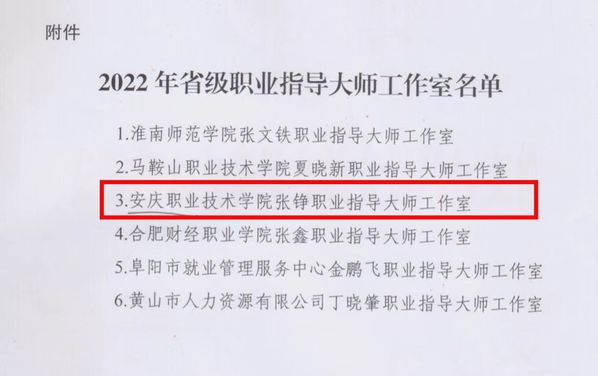 日前,安徽省省級職業(yè)指導(dǎo)大師工作室名單公布,安慶職業(yè)技術(shù)學(xué)院“張錚職業(yè)指導(dǎo)大師工作室”,經(jīng)過市級推薦、匯報答辯、專家評審、公示確認(rèn)等程序,獲評省級職業(yè)指導(dǎo)大師工作室,這是我市第一個省級高校職業(yè)指導(dǎo)大師工作室。