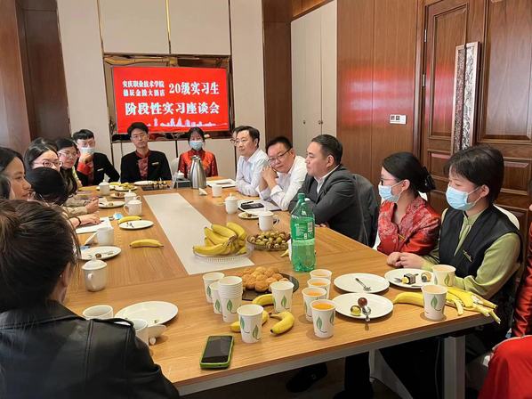 隨后,團隊一行來到德辰金陵大酒店看望目前在酒店實習工作的20級酒店管理與數(shù)字化專業(yè)學生。實習座談會上,每一位實習生暢談了4個月以來的實習收獲和感受,大家認為雖然實習工作有時候很辛苦,但是大家學到了很多學校和書本上學不到的東西,職場意識大大提升、與人交流更加自信、團結協(xié)作更加默契。酒店方總經(jīng)理、人力資源總監(jiān)、餐飲總監(jiān)等就實習生實習期間的表現(xiàn)給予了充分的贊賞和肯定,同時也給同學們提出了中肯的意見和建議。老師們對同學們的實習表現(xiàn)、收獲、成長表示祝賀,感到欣慰,勉勵實習生再接再厲,堅守本職,更要做好實習后的職業(yè)生涯規(guī)劃,深耕酒店行業(yè),努力成為一名現(xiàn)代服務業(yè)優(yōu)秀的出色的酒店人。(文:陳文玲 圖:張 紅 審稿:陳 穎)