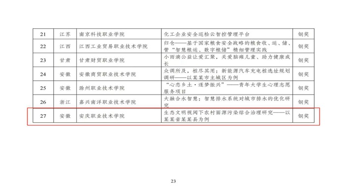 該作品著眼于“農(nóng)村面源污染”問題,致力于加強(qiáng)農(nóng)村生態(tài)文明建設(shè),有力推進(jìn)美麗鄉(xiāng)村建設(shè),增強(qiáng)農(nóng)民群眾的幸福感和獲得感,極具社會(huì)價(jià)值和實(shí)踐意義。為備戰(zhàn)本次賽事,學(xué)院領(lǐng)導(dǎo)和指導(dǎo)老師精心組織,積極籌備,努力提高競(jìng)技水平。校領(lǐng)導(dǎo)高度重視此次國(guó)賽,校黨委委員、統(tǒng)戰(zhàn)部部長(zhǎng)李五一、團(tuán)委及學(xué)生處負(fù)責(zé)同志親臨鄭州,慰問和鼓勵(lì)參賽學(xué)生。同學(xué)們也不負(fù)眾望,最終在眾多強(qiáng)隊(duì)中脫穎而出,榮獲銅獎(jiǎng),充分展示了安慶職院學(xué)子的青春風(fēng)采。