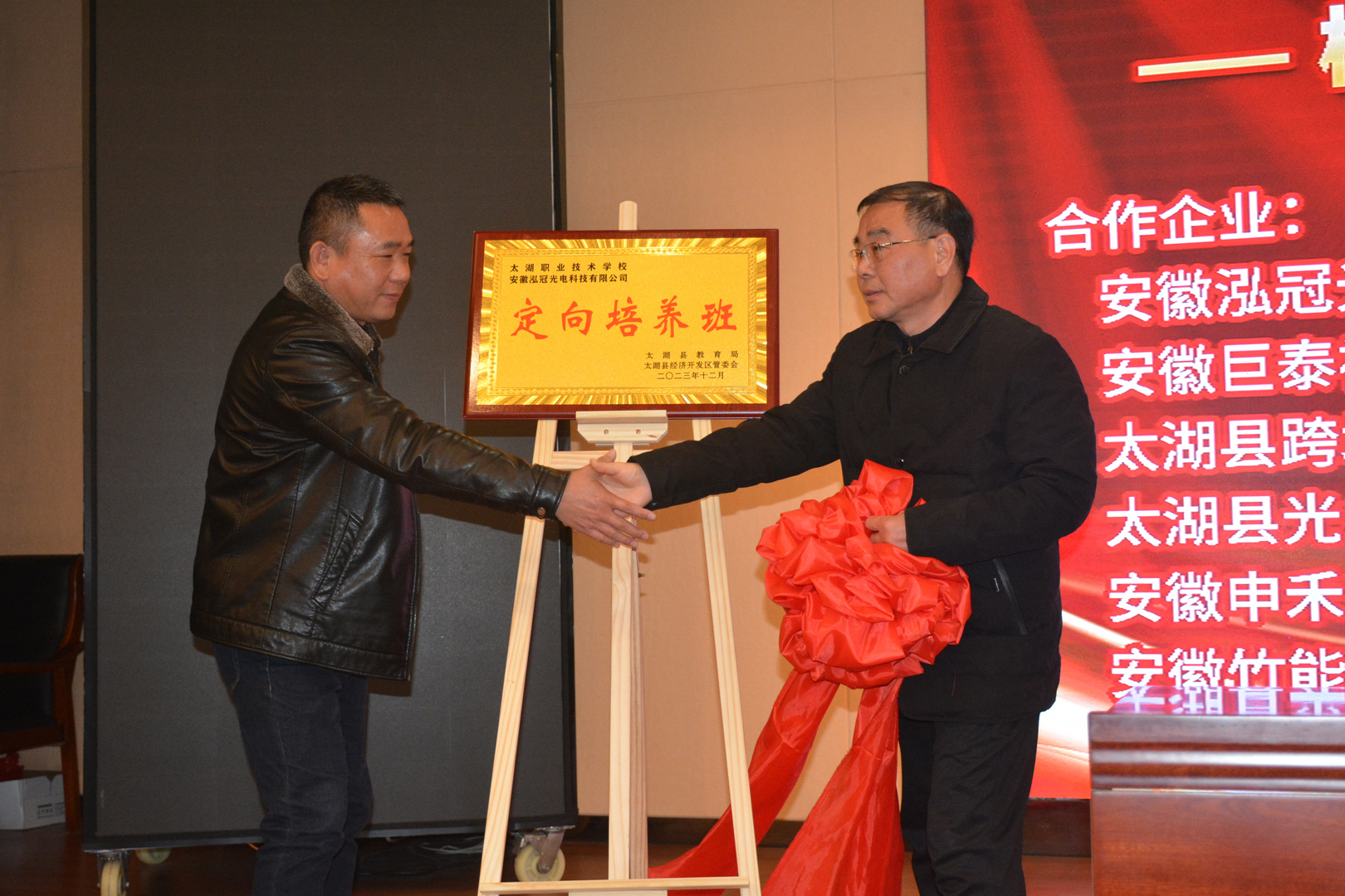 1月10日,太湖職業(yè)技術學校在學校致公樓一樓多功能廳隆重舉行校企合作簽約暨2023級“企業(yè)定向培養(yǎng)班”揭牌儀式。安徽泓冠光電科技有限公司、安徽巨泰視顯光電科技有限公司、安徽申禾智能科技有限公司、太湖縣跨境電商產業(yè)園、太湖縣光華鋁業(yè)有限公司、安徽竹能碳纖維材料有限公司等六家企業(yè)分別與學校成功簽訂校企合作協(xié)議,太湖縣人社局、太湖縣企業(yè)服務中心、太湖縣教育局等相關部門領導受邀出席,并與六家企業(yè)代表共同為“企業(yè)定向培養(yǎng)班”揭牌。