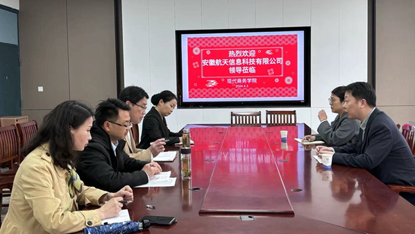 4月3日上午,安徽航天信息科技有限公司一行來(lái)到安慶職業(yè)技術(shù)學(xué)院洽談合作,安慶職院現(xiàn)代商務(wù)學(xué)院黨總支書記、院長(zhǎng)金啟勝熱情接待了安徽航天信息科技有限公司的來(lái)賓。