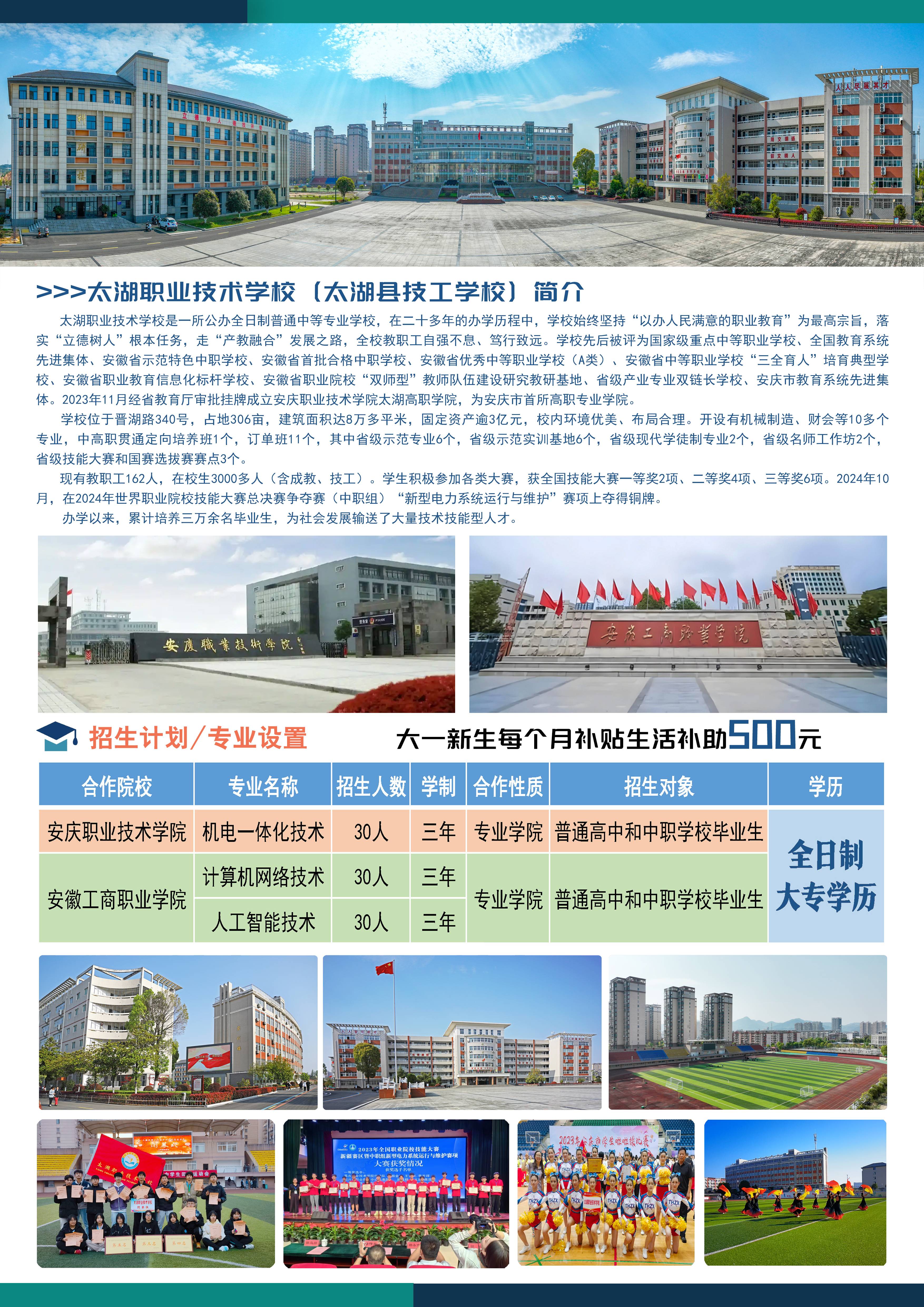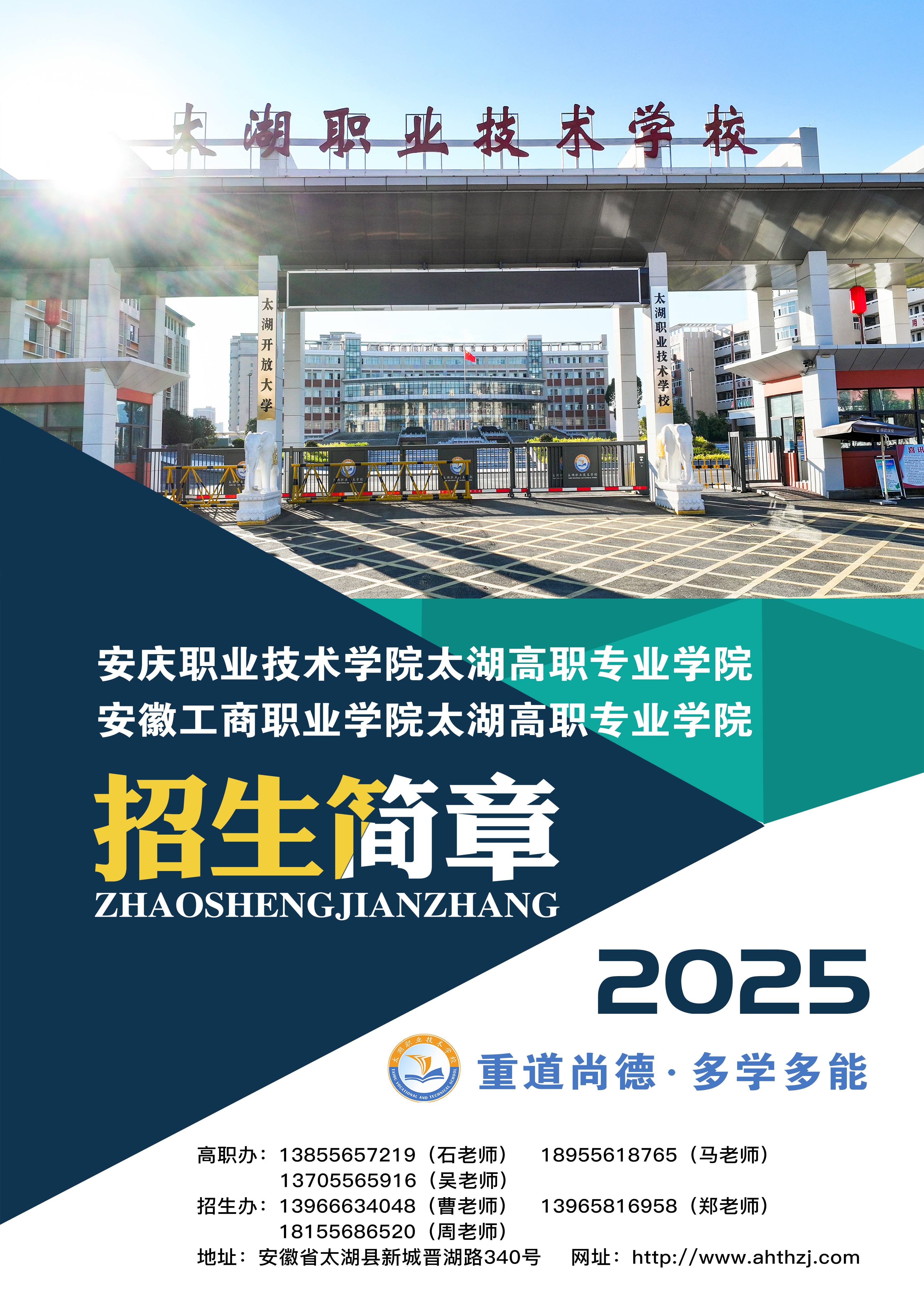 經(jīng)省教育廳批準(zhǔn),太湖職業(yè)技術(shù)學(xué)校與安慶職業(yè)技術(shù)學(xué)院、安徽工商職業(yè)學(xué)院聯(lián)合辦學(xué)太湖高職專業(yè)學(xué)院。其中,安慶職業(yè)技術(shù)學(xué)院機(jī)電一體化專業(yè)30人,安徽工商職業(yè)學(xué)院計算機(jī)網(wǎng)絡(luò)技術(shù)30人、人工智能技術(shù)30人。三個專業(yè)均對接前沿科技就業(yè)崗位,全面滿足企業(yè)人才需求。