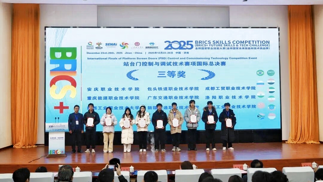 12月22日至26日,2025金磚國(guó)家職業(yè)技能大賽站臺(tái)門(mén)控制與調(diào)試技術(shù)賽項(xiàng)國(guó)際總決賽在山東職業(yè)學(xué)院舉行。安慶職業(yè)技術(shù)學(xué)院機(jī)電工程學(xué)院李陶勝、王淑芳兩位老師指導(dǎo)馮術(shù)鵬、張宇航兩位學(xué)生獲得三等獎(jiǎng)。